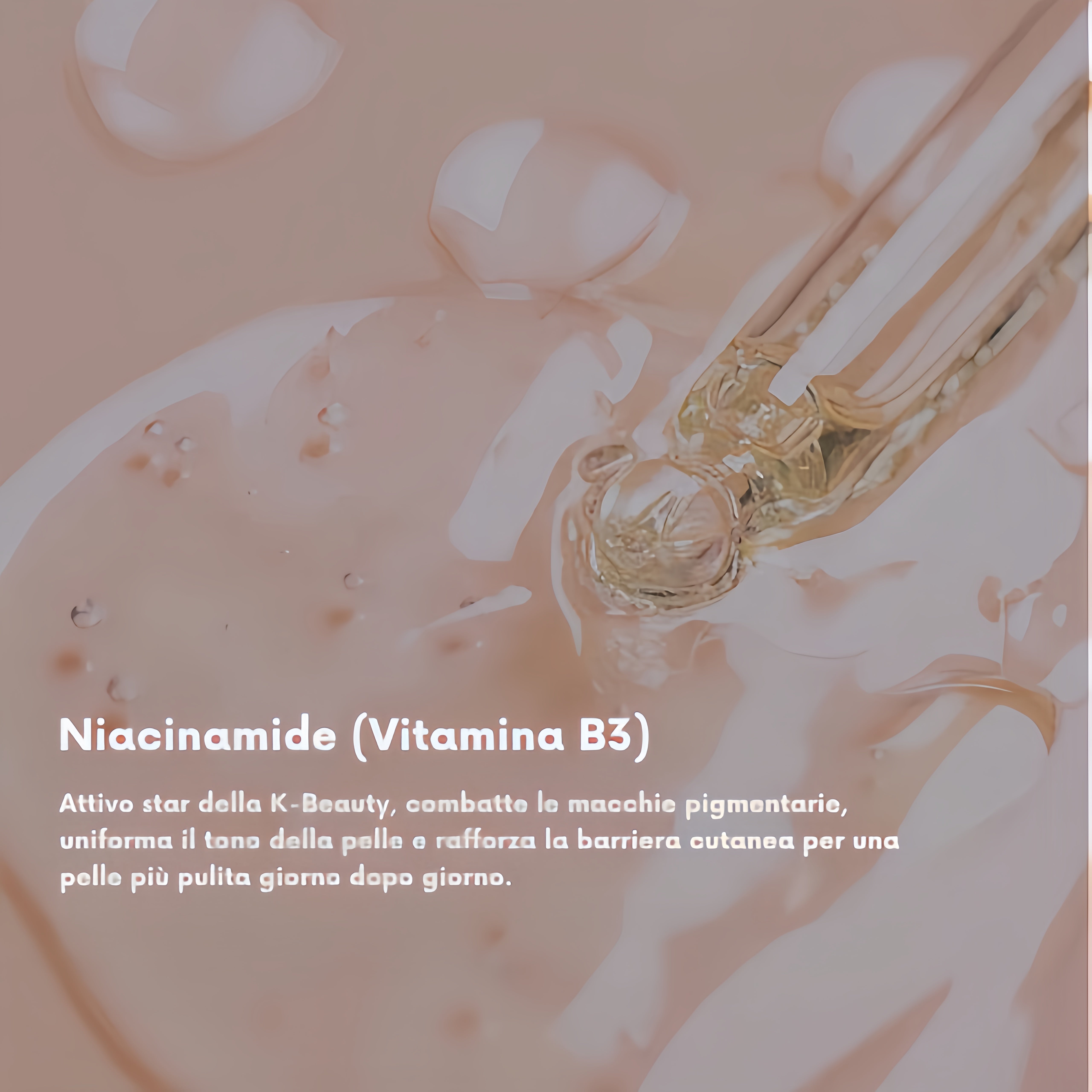 Niacinamide (Vitamina B3) – Riduce visibilmente i pori, bilancia il sebo e rivela la luminosità della pelle